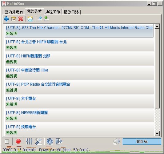 My Radio Box 是一套線上收音機軟體,您可以搜尋網路上已經存在的網路電台,不論是搖滾音樂、流行音樂、古典音樂.....,軟體都可以為您歸類尋找,只要您想的到的音 樂類型,大致上都可以順利的搜尋,而且搜尋到的網路電台會依照熱門程度來排序,除了可搜尋全球的網路電台之外,您可以已將喜愛的網路電台加入到我的最愛 中,下次啟動就不用重新尋找,使用上非常的方便,此外本軟體還內建了簡單的錄音功能,您可以一邊收聽,一邊錄製,還有預約收聽的功能,每個電台都可以指定 您所要收聽的時間,播放的電台時電台名稱在 MSN 上也可以顯示。